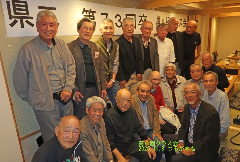 令和7(2025)年11月8日(土)に、第6回クラス会を実施しました。前回(平成28(2016)年1月9日(土))の実施からかなり時間が過ぎました。その間には、新型コロナウイルスの感染拡大防止対策のため外出や行動が制限されるなどのこともあり、クラス会を開催することなく現在に至っていました。数年前から「開催してほしい」との要望もあって幹事として気になっていましたが、1月が来ると10年になるのを機に重い腰をやっと上げてクラス会を開催しました。今回も宴会場探しには情報をたくさん持っている福島君にお願いしました。当日は、この日のために倉敷市、横浜市、守口市の県外から参加した3名を含む18名でしたが、2時間の時間が「あっという間に」過ぎてしまうほど楽しく級友と交流することができました。心配なのは、今回参加できなかった級友からの「体調が悪い」、「足腰の調子が悪い」などのメッセージが数人から届いたことです。