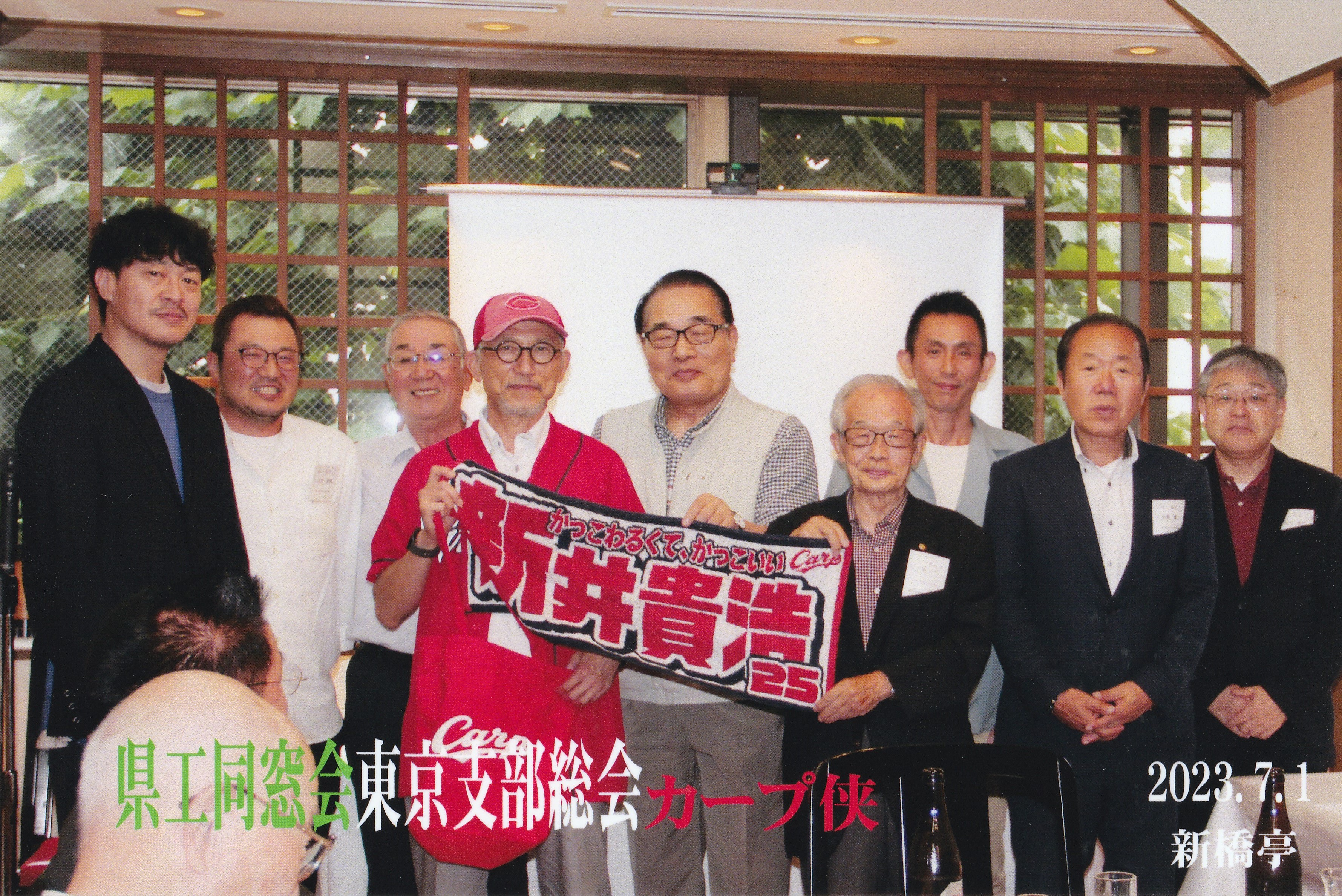 飛び入りで、昨年までカープ関東応援団長の経験をした印藤浩行さん(59回電気)を中心に新井監督のユニホームを着衣して、カープ及び新井監督にエールを送りました